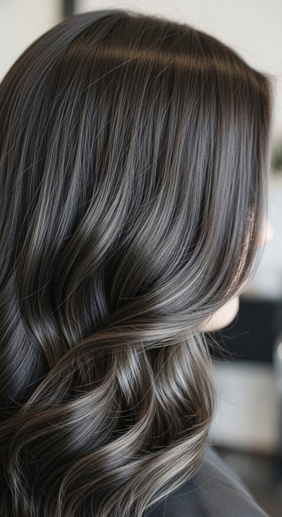 Smoky ash highlights create a dramatic yet refined effect on long dark brown hair. The cool smoky tones add depth and movement, giving long hair a luxurious, editorial appearance. This style is particularly popular because it looks stunning in natural lighting and photographs beautifully — perfect for Pinterest inspiration boards.