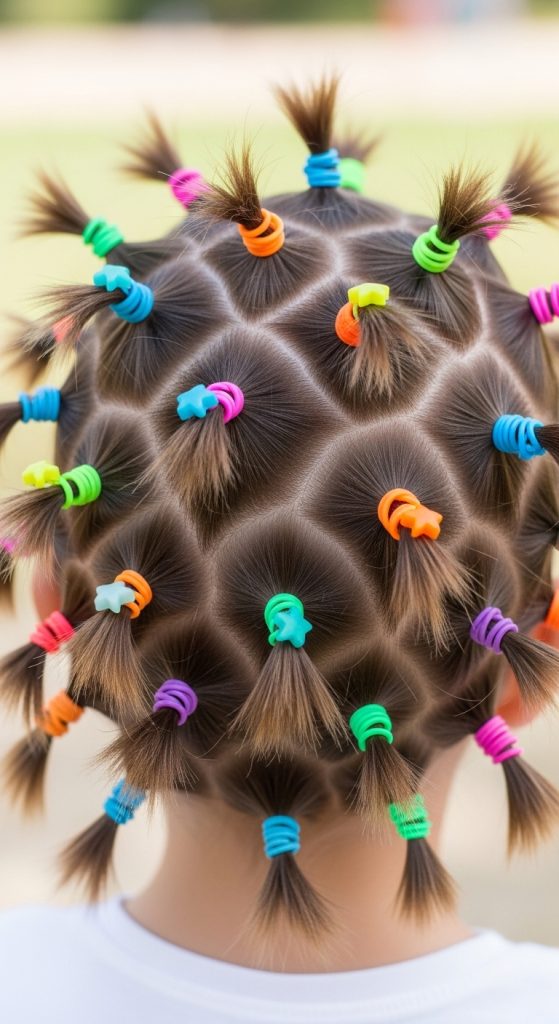 Divide the hair into small sections and secure each one into mini ponytails using colorful rubber bands.