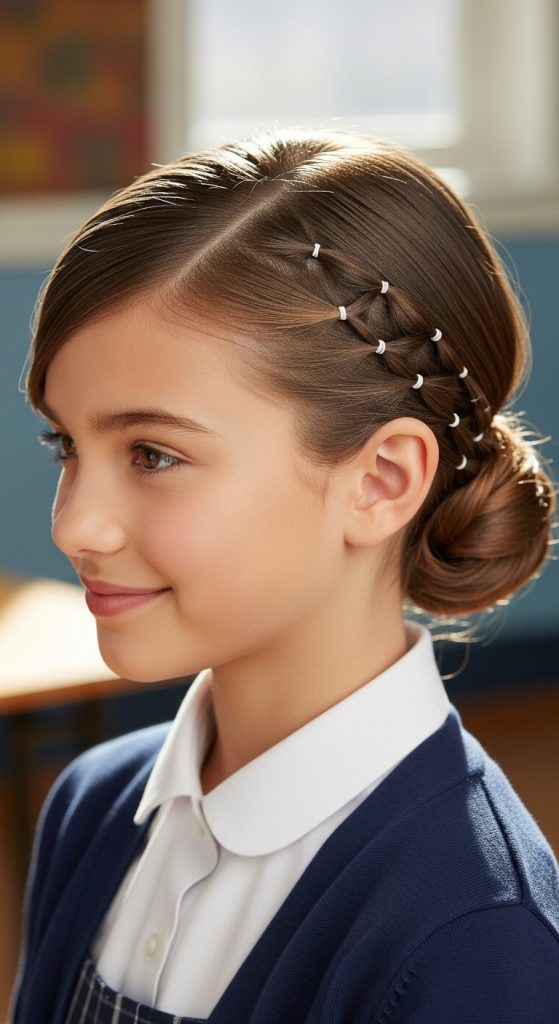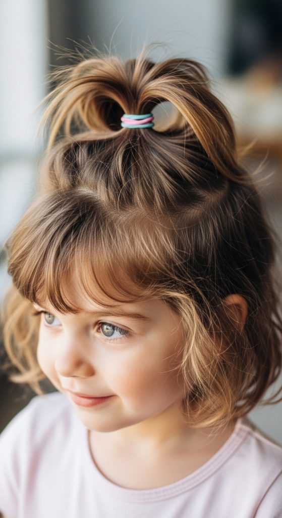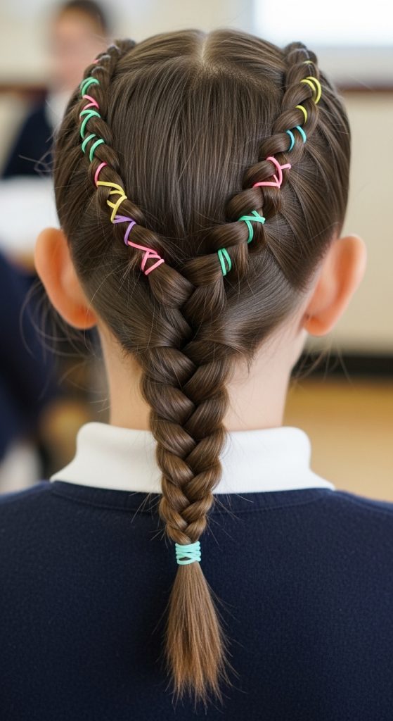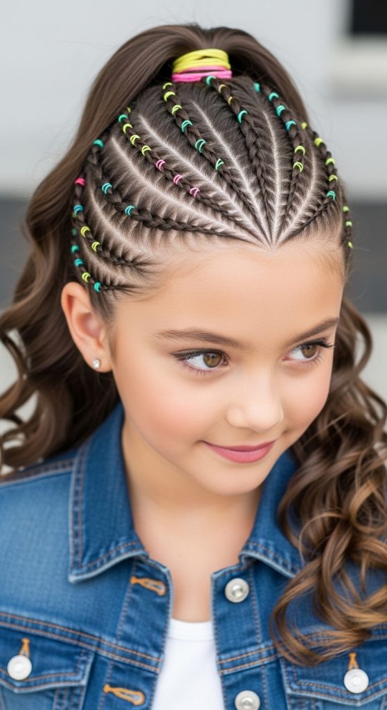 The braid and rubber band hairstyle for kids combines structure and creativity.