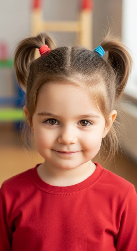 The double ponytail hairstyle for kids is quick and cute.
