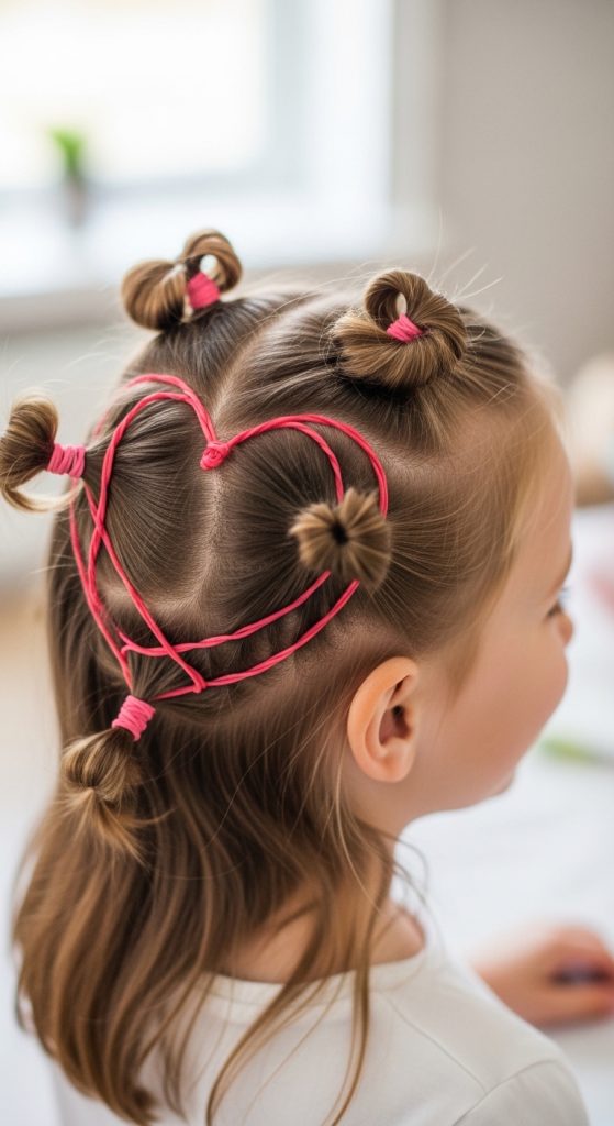 The heart rubber band hairstyle for kids is creative and adorable.