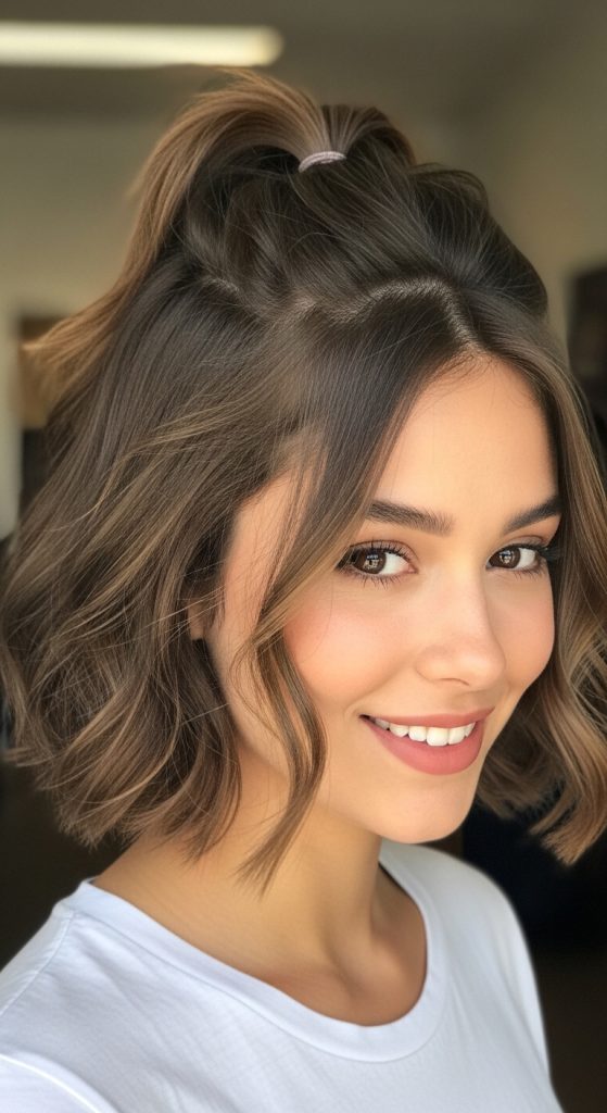 The half-up rubber band hairstyle for short hair is soft and trendy.