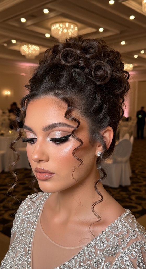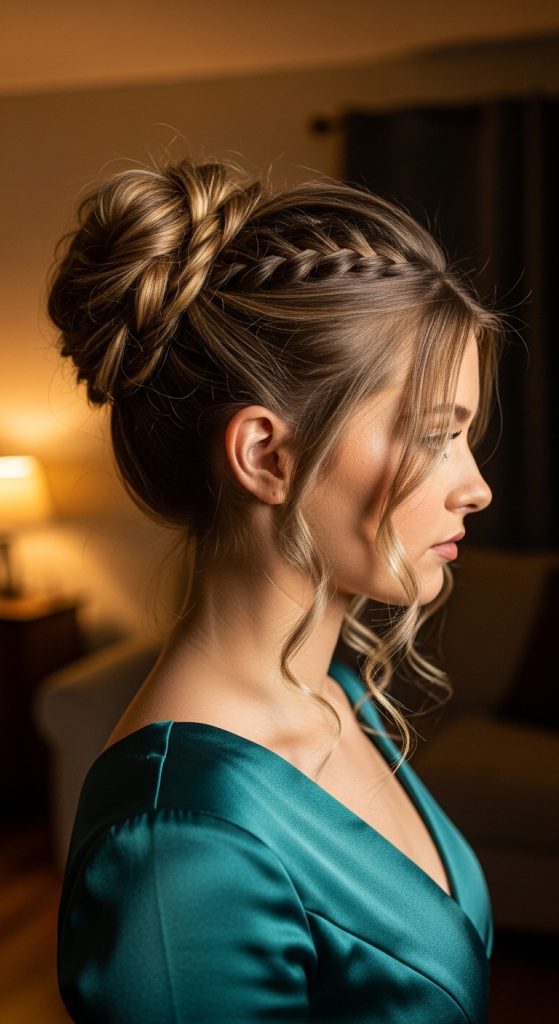 The braided prom bun introduces texture and detail into a traditional bun hairstyle. This design combines braiding techniques with the structure of a bun. The braid adds visual interest while helping the hairstyle remain secure throughout the event.