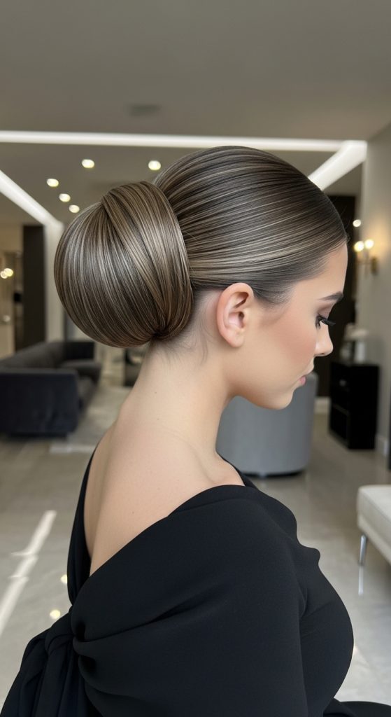The sleek bun emphasizes smooth texture and simple structure. The hairstyle focuses on clean lines and minimal decoration.