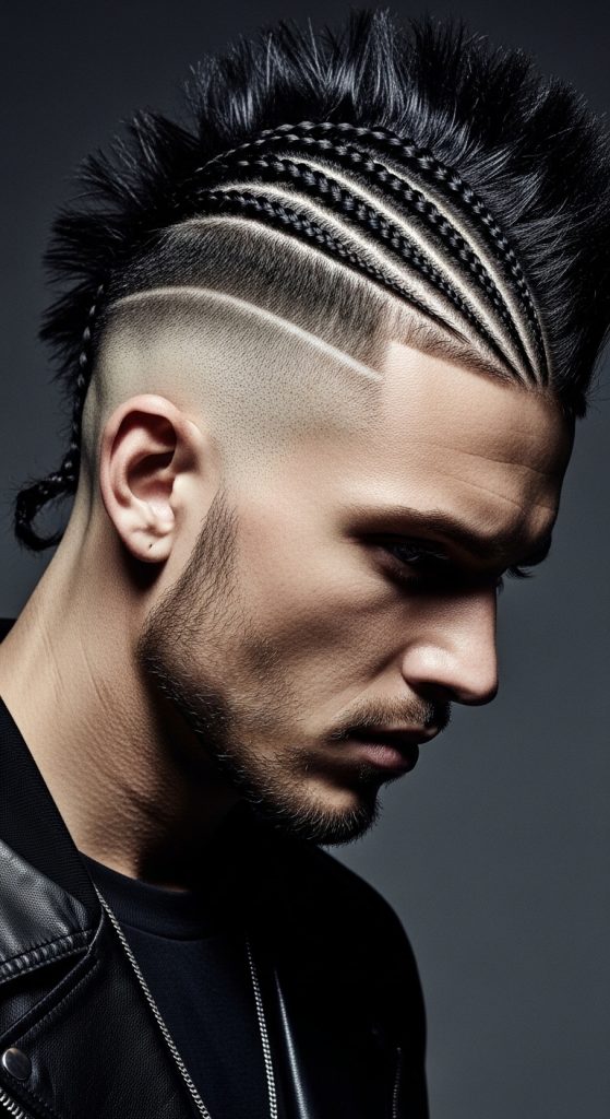 Mohawk cornrows are bold, edgy, and attention-grabbing. The sides of the head are faded or shaved, leaving a central strip of braided hair running from front to back. This style merges barber artistry with braided creativity.