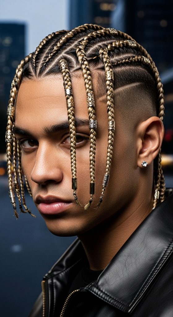 Cornrows with beads add personality, culture, and creative expression to your hairstyle. While traditionally popular in various African styles, modern men are embracing beads for a bold fashion-forward statement. Clear, wooden, metallic, or colored beads can dramatically change the vibe of the braids.