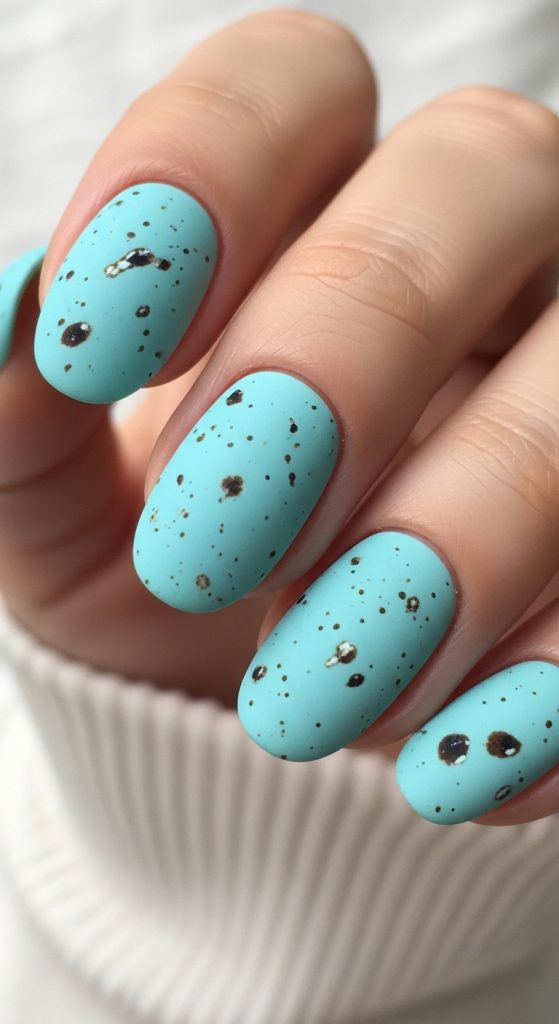 Robin’s egg blue nails are inspired by the natural speckled eggs found in spring nests. This design features a soft turquoise-blue base with delicate brown or black speckles scattered across the surface. The combination feels earthy, seasonal, and subtly festive without being overly colorful.