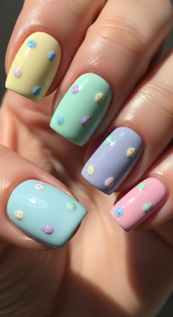 Each nail features a different pastel shade with tiny egg-inspired details.