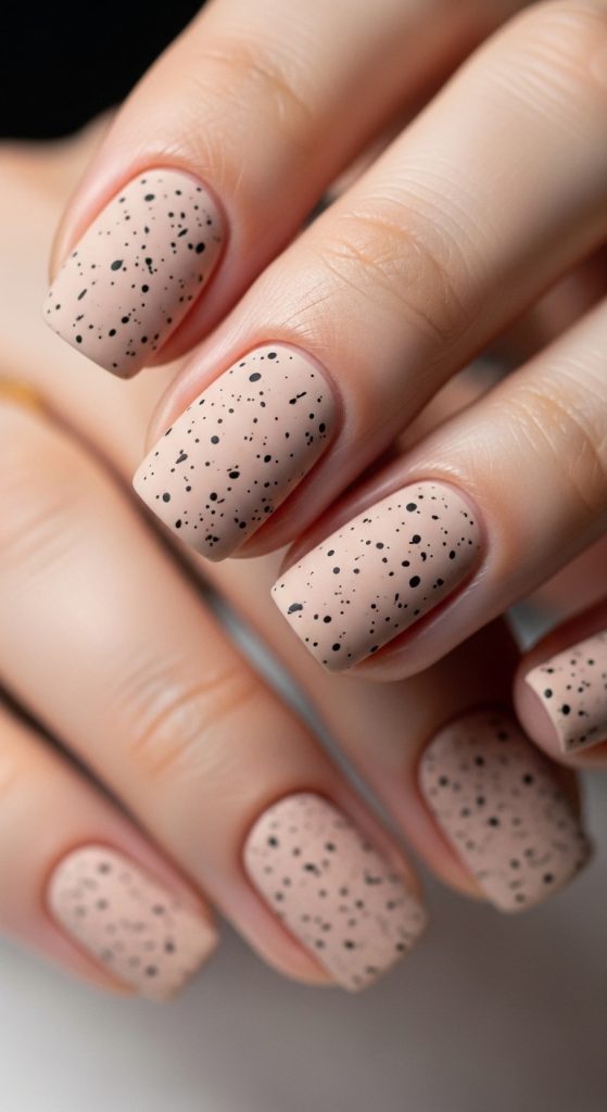 For a subtle take on the trend, use a nude or beige base with tiny speckles. The result resembles natural eggs with a chic, neutral vibe.