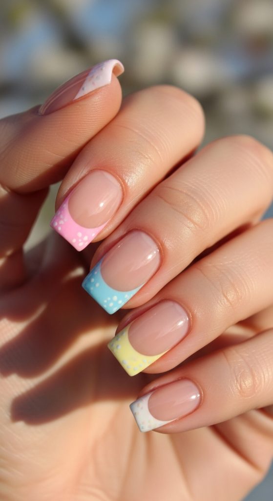 A pastel egg French manicure swaps classic white tips for soft pastel colors and adds light speckles on the tips only.