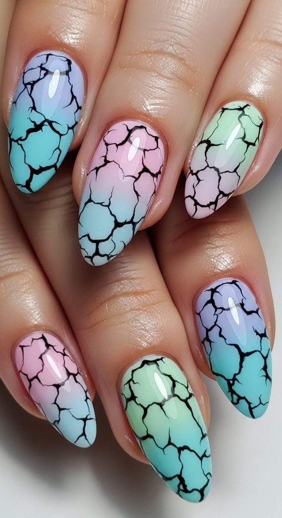 Cracked egg nail art features a pastel base with a thin black or dark brown crackle design layered over it, mimicking a cracked eggshell. This style is edgy while still playful and seasonal.