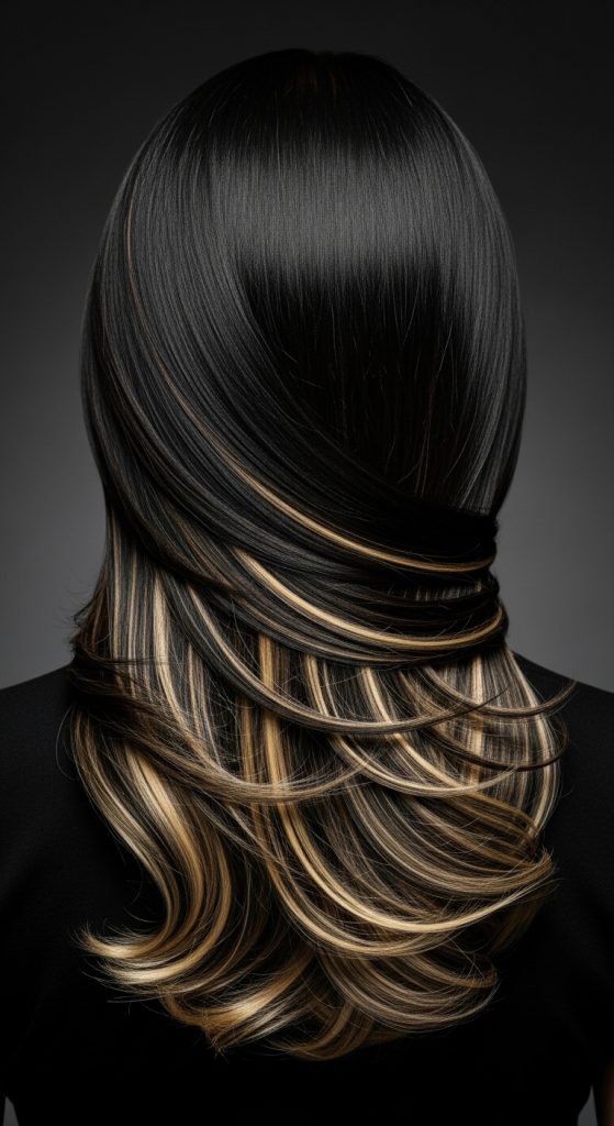 If platinum feels too extreme, a creamy blonde peekaboo offers softer contrast while still brightening black hair. The warmth balances the deep base beautifully.