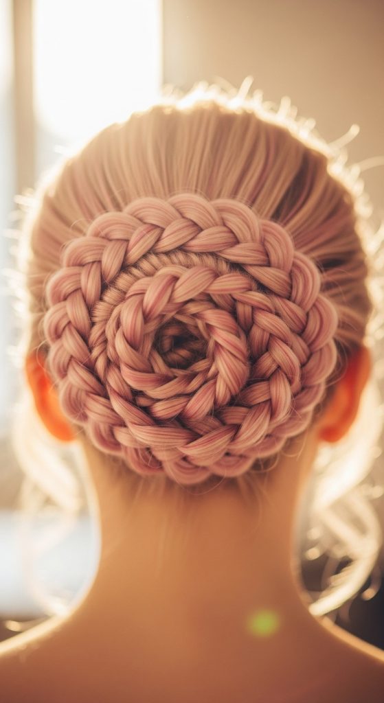 Braided buns reveal hidden pink strands beautifully as colors intertwine. This is perfect for special events or prom-inspired looks.