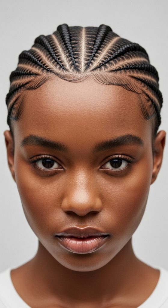 The classic short Fulani braid style keeps the traditional structure but at a chin or shoulder length. It features a clean center part, straight-back cornrows, and two signature face-framing braids.